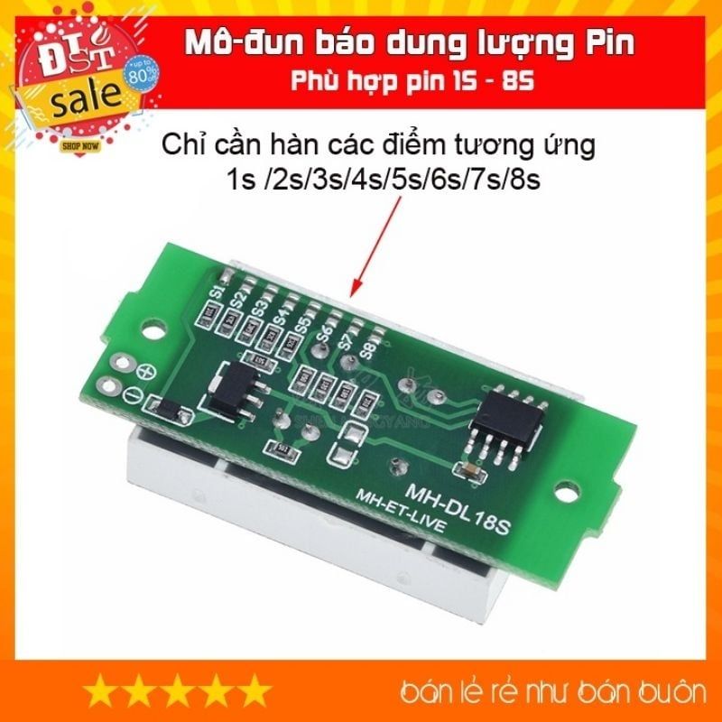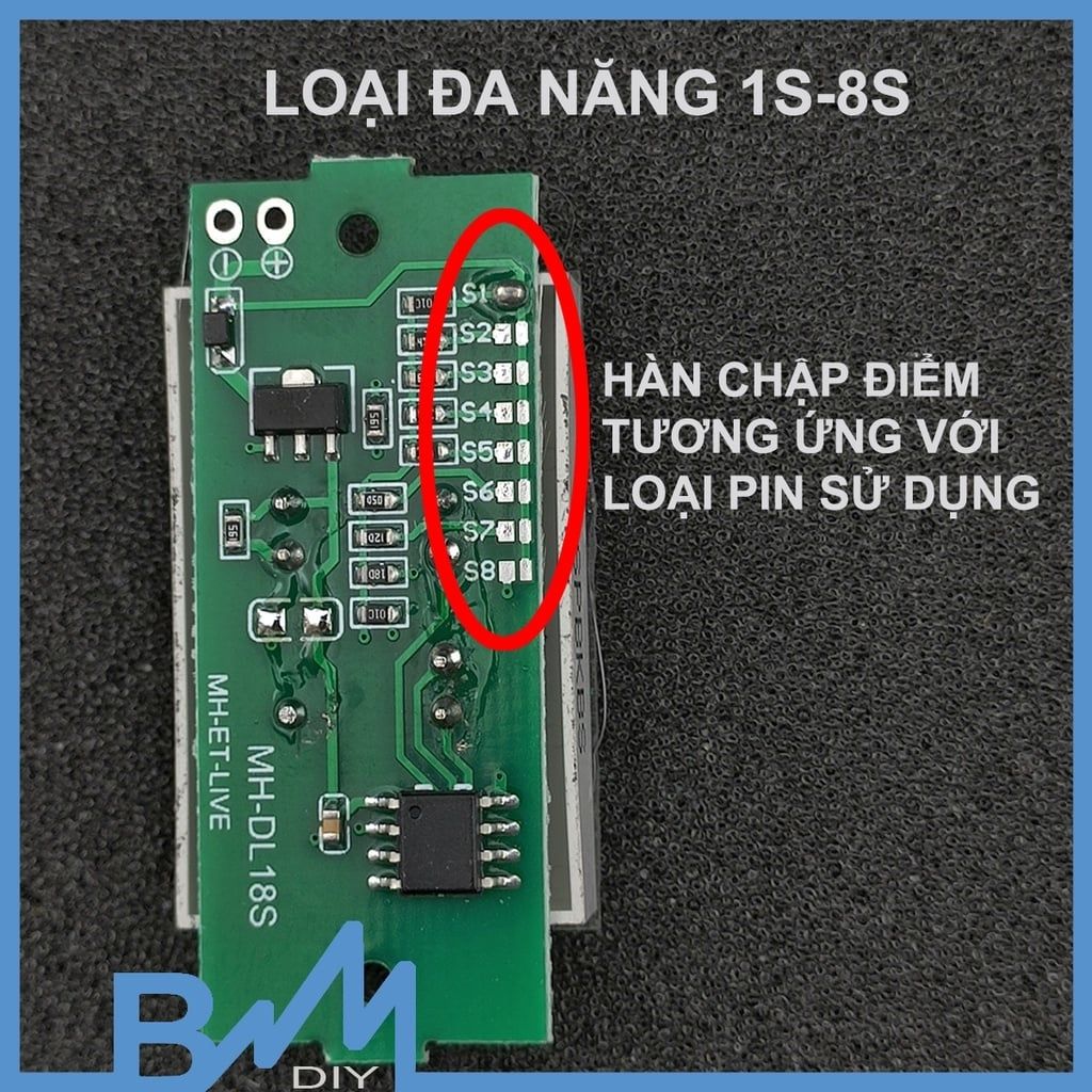 Lưu ý: vui lòng mua đơn hàng từ 20k trở lên để chúng tôi đủ bù vào chi phí gói hàng. cảm ơn bạn - Khi nhận hàng, mạch mặc định sẽ ở chế độ báo pin 1S - Tuỳ vào nhu cầu sử dụng, bạn cần hàn kết nối 2 tiếp điểm tương ứng ở mặt sau và ngắt tiếp điểm ở S1 (ví dụ bạn bạn dùng pin 3s thì hàn 2 tiếp điểm ở vị trí S3 và ngắt 2 tiếp điểm ở vị trí S1)