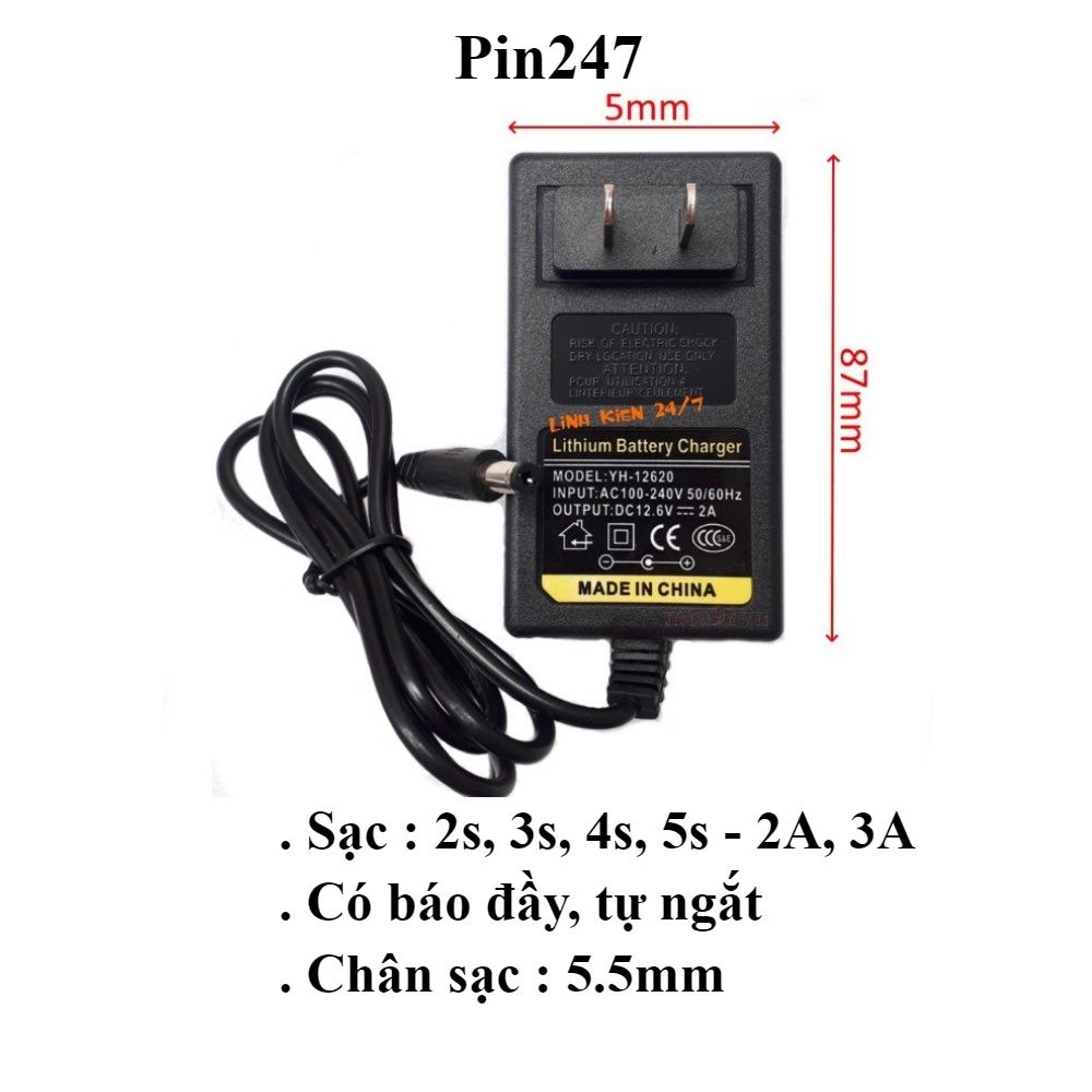 Thông số sản phẩm và sử dụng: » Sạc pin Li-ion 2s - 8.4v, 3s -12.6v , 4s - 16.8v, 5s - 21v , đèn báo đầy. » Điện thế ngõ vào: AC 100 - 240V. » Điện thế ngõ ra: DC 8.4v, 12.6v, 16,8v, 21v - 2A » Đầu jack cắm sạc: 5.5*2.5mm (thông dụng), cắm được với giắc cái DC 5.5x2.1mm và 5.5x2.5mm » Sử dụng: Sạc pin Li-ion 2s - 8.4v, 3s -12.6v , 4s - 16.8v, 5s - 21v (2, 3, 4, 5 cell/cặp cell nối tiếp). » Đèn báo sạc: Khi sạc pin, đèn báo đỏ. Khi pin đầy, đèn báo xanh » Sản phẩm là 01 Sạc, không bao gồm mạch, pin hay sản phẩm minh hoạ khác. Màu sắc, hình ảnh có thể khác so với thực tế, chức năng không đổi. Các thông số nêu trên là từ nhà sản xuất (Nsx), shop chưa kiểm chứng thực tế ------------- Một số lưu ý khi sử dụng và đổi/trả hàng: - Khi pin còn SẠC OK thì đèn sạc mới báo màu ĐỎ. - Khi pin ĐẦY THẬT thì đèn sạc mới báo XANH. (Một số trường hợp pin hỏng hoặc mạch bảo vệ pin hỏng đèn sẽ xanh hoặc nhấp nháy xanh đỏ) - Mạch bảo vệ pin (BMS) mới có chức năng TỰ NGẮT khi pin đầy. Sạc chỉ có chức năng BÁO ĐẦY pin mà thôi - Cần kiểm tra sp trước khi dùng (phải có video). Nếu phát hiện sp không mới 100% hay không còn nguyên vẹn do vận chuyển hoặc lỗi Nsx… Hãy giữ nguyên để Shop đổi - Trước khi cắm sạc vào pin (xe), hãy chắc rằng giắc cắm đúng chiều (không ngược/chạm), pin còn dùng được (sạc -xả bình thường) và đảm bảo điện áp giữa sạc và pin (xe) là phù hợp - Nếu cắm sạc cho pin(xe) mà đèn sạc nhấp nháy đỏ là pin(xe) đang bị hỏng/lỗi, không sạc được hoặc đang cắm nhầm với pin(xe) bị sai mức điện áp. Khi đó cần tháo sạc ra khỏi pin(xe) ngay lập tức. Nếu tiếp tục cho sạc, sạc sẽ bị lỗi (luôn sáng đỏ hoặc thiếu áp...). Trường hợp lỗi này là do sử dụng sai và không phải lỗi từ nhà sản xuất. Nên shop không nhận đổi/trả. Mong Quý khách lưu ý! ------------ #sac3s12.6v #sacli-ion3s12.6v #sacpin3s12.6v #sacpinli-ion3s12.6v #sacpinmaykhoan12v #sacmaykhoanpin12v #sacpinmaykhoan12vli-ion #sac3s12.6v #sacli-ion3s12.6v #sacpin3s12.6v #sacpinli-ion3s12.6v #sacpinmaykhoan12v #sacmaykhoanpin12v #sacpinmaykhoan12vli-ion